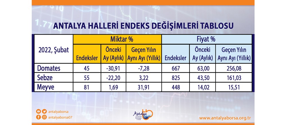 Antalya Ticaret Borsası (ATB), Şubat ayı Antalya Halleri Domates, Sebze ve Meyve Endeksini açıkladı. Antalya hallerinde işlem gören domates, sebze ve meyvelerin işlem miktar ve fiyatlarıyla ilgili endeks değerlerinin değişimleri, 2022 Şubat ayında bir önceki aya göre ve geçen yılın aynı ayına göre aşağıda verilen tablodaki gibi değişti: