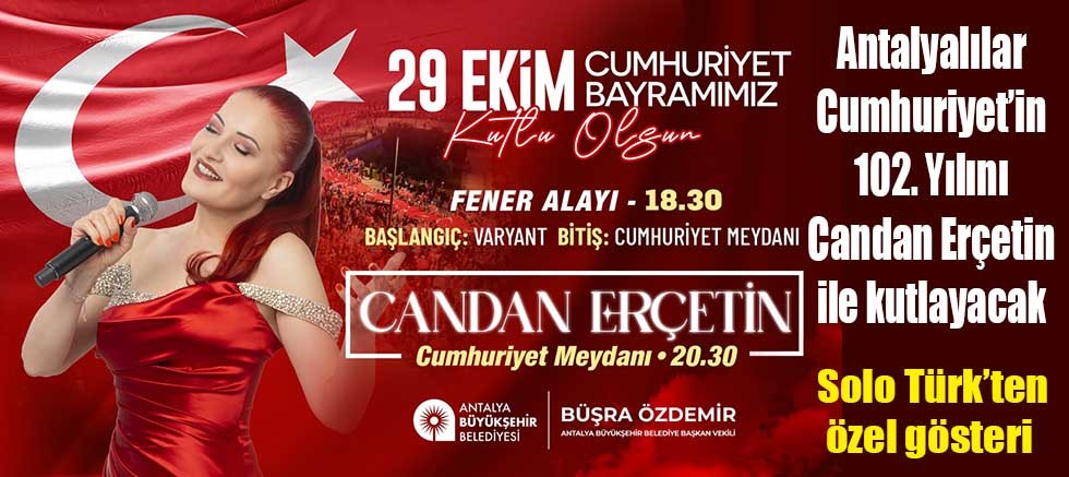 Antalya Büyükşehir Belediyesi, 29 Ekim Cumhuriyet Bayramı’nı büyük bir coşkuyla kutlamaya hazırlanıyor. Büyükşehir Belediyesi, Cumhuriyet’in 102. Yılını, Solo Türk gösterisi, fener alayı ve Cumhuriyet Meydanı’nda düzenlenecek Candan Erçetin konseriyle kutlayacak.