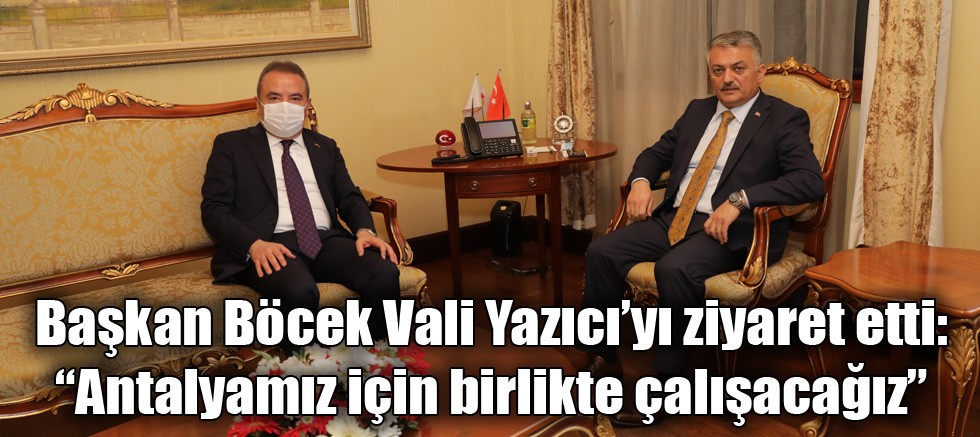 Antalya Büyükşehir Belediye Başkanı Muhittin Böcek Antalya Valisi olarak göreve başlayan Ersin Yazıcı'yı makamında ziyaret etti. Vali Yazıcı’ya yeni görevinde başarı dileyen Başkan Böcek, “Büyükşehir Belediyemiz ve Valiliğimiz işbirliğiyle Antalyamıza güzel hizmetler sunmaya devam edeceğiz” dedi.