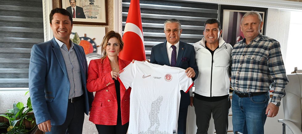 Tezel ve Özen ise Başkan Topaloğlu’na çalışmalarında kolaylıklar dileyerek, Başkan Topaloğlu’na isminin yazılı olduğu Antalyaspor forması hediye etti.