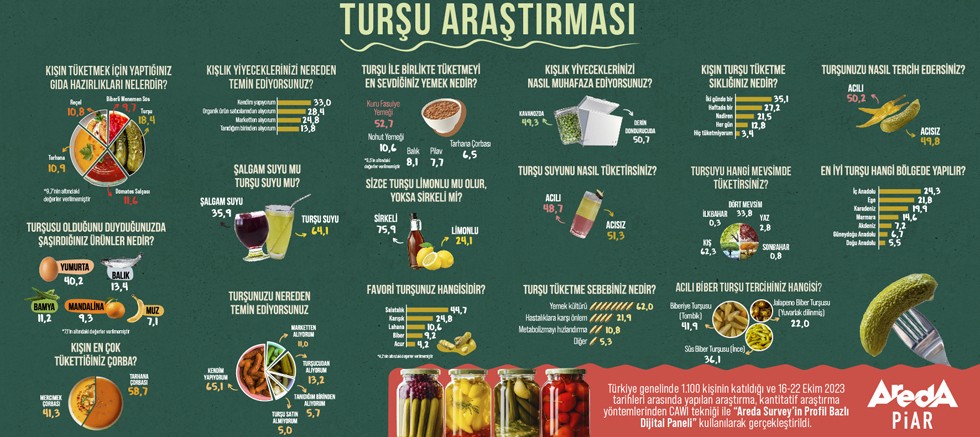 Areda Piar'ın bin 100 kişiyle gerçekleştirdiği araştırmaya göre, tüketiciler kışın tüketmek için yaptığı gıda hazırlıklarının başında yüzde 18,4 ile turşu geliyor. Diğer kış hazırlıkları ise sırasıyla şöyle; domates 11,6, tarhana yüzde 10,9, reçel yüzde 10,8, biberli menemen sosu yüzde 9,7, biber salçası yüzde 8,3, domates suyu yüzde 7,9, taze sebze yüzde 7,0, biber ve patlıcan kurusu yüzde 6,3, komposto yüzde 4,7, bamya kurusu yüzde 2,9 ve diğer seçeneği yüzde 1,5.