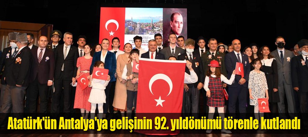 Antalya'yı 92 yıl önce ziyaret ederek vatandaşların sevgi gösterileriyle karşılanan Atatürk’ün, kenti ziyaret yıldönümü törenle kutlandı. Atatürk Kültür Merkezi'nde (AKM) düzenlenen törene Vali Ersin Yazıcı’nın yanı sıra; Garnizon Komutanı Piyade Albay Erdal Köse, Antalya Büyükşehir Belediyesi Genel Sekreteri Cansel Tuncer, Vali Yardımcısı Yalçın Sezgin, Döşemealtı Kaymakamı Nuri Cengiz, Konyaaltı Kaymakamı Kamil Köten, Kepez Kaymakamı Nusret Şahin, Muratpaşa Kaymakamı Orhan Burhan, İl Emniyet Müdürü Mehmet Murat Ulucan, Sahil Güvenlik Komutanı Yarbay Murat Sezgin, Hava Meydan Komutanı Hava Pilot Yarbay Esra Özatay, İl Milli Eğitim Müdürü Emre Çalışkan, Antalya Esnaf ve Sanatkârlar Odaları Birliği Başkanı Adlıhan Dere, protokol üyeleri, öğretmenler, öğrenciler ve vatandaşlar katıldı.
