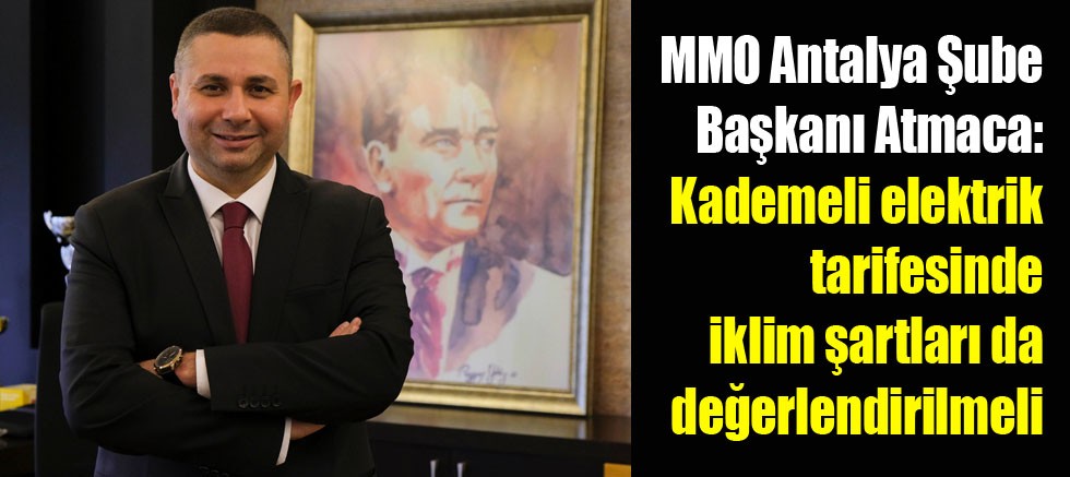 MMO Antalya Şube Başkanı Prof. Dr. İbrahim Atmaca, elektrikte kademeli tarife uygulamasının iklim şartları göz alınarak yeniden değerlendirilmesi gerektiğini belirterek, 210 kilovat elektriksel kademe değerinin yaz aylarında Antalya gibi ılıman iklimlerde için yeterli olmayacağını savundu.