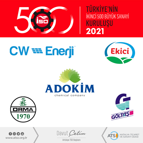 “Antalya’dan 3, Isparta’dan 2 olmak üzere bölgemizden beş firma İkinci 500 Büyük Sanayi Kuruluşu arasında yer almıştır. Genel sıralamada Antalya’dan “CW Enerji Mühendislik Tic. ve San. A.Ş.” 2020 yılında 240. sırada iken 2021 yılında 142. sırada, “Ekiciler Süt Gıda Tarım Hayvancılık San. ve Tic. A.Ş.“ firması 2020 yılında 44. sırada iken 2021 yılında 253. sırada ve “Adokim Kimya San. ve Tic. A.Ş.” 2020 yılında sıralamada yer almazken 2021 yılında 427. sırada yer almıştır.