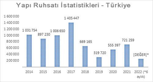 “TÜİK tarafından belediyelerden derlenen, inşaat sektöründe faaliyet hacmine ve konut arzındaki gelişmeye ışık tutan yapı ruhsat verilerine göre, Türkiye genelinde, 2022 yılının ilk yarısında yapı ruhsatı alınan daire sayısı %21 azalmıştır.