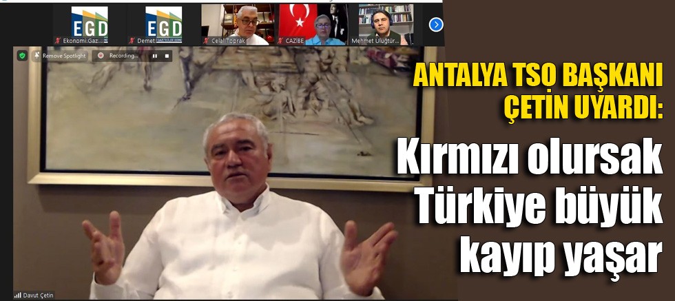 Antalya Ticaret ve Sanayi Odası Başkanı Davut Çetin, pandemide turist sayısının yüzde 78 azaldığını belirterek, ‘Kovit 19 Risk Haritası’nda turuncu olan Antalya’nın kırmızıya dönüşmesinin Türkiye’ye büyük kayıp yaşatacağını belirterek, “Turizm sezonu başlıyor. Aylardır ‘20 gün kapanalım’ diye talepte bulunuyoruz. Antalya’nın özel tedbirlere ihtiyacı var. Büyük kayıp yaşamamak için il bazında tedbirlere geçilmeli” dedi.