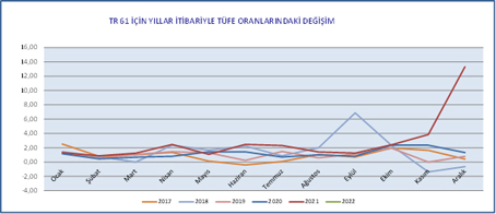 Bölgemizdeki TÜFE oranı, aylık bazda yüzde 11,36, yıllık bazda yüzde 52,75 olarak gerçekleşmiştir. Bölgemizde ana harcama grupları itibariyle bir ay önceye göre sırasıyla en yüksek artış yüzde 23,36 ile kira, elektrik, doğalgaz faturalarını da içeren “konut” grubunda olmuş, bunu yüzde 21,76 ile “alkollü içecekler ve tütün” ve yüzde 11,71 ile “ulaştırma” harcama grupları izlemiştir. Giyim ve ayakkabı grubunda ise yüzde 0,18’lik düşüş gözlenmiştir. Yıllık enflasyonda ise en yüksek artış yüzde 73,17 ile “ulaştırma”, yüzde 58,39 ile “ev eşyası” ve yüzde 57,49 ile “konut” gruplarında gerçekleşmiştir. Giyim enflasyonundaki farklılaşmanın TÜİK verilerinden kaynaklanması muhtemeldir.