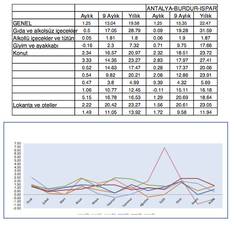 Bölgemizde enflasyon aylık bazda Türkiye ortalaması ile aynı kalırken, dokuz aylık ve yıllık bazda Türkiye ortalamasının üzerinde olduğu görülmüştür. Bu oranlara göre Antalya, Isparta ve Burdur illerini kapsayan Batı Akdeniz Bölgesi, 26 bölge arasında aylık bazda on ikinci, dokuz aylık bazda ve yıllık bazda ise ikinci sırada yer almıştır.”