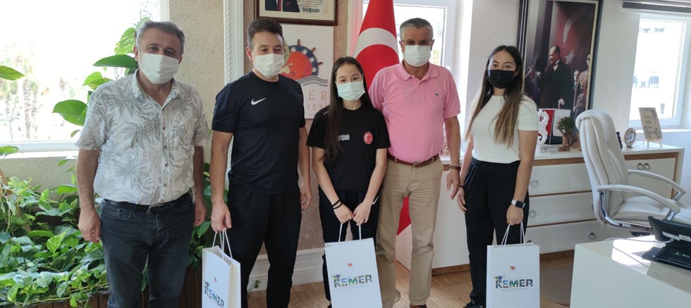 Kemer Belediyesi Kültür ve Sosyal İşler Müdürü Asım Yıldırım’ın da hazır bulunduğu ziyarette Başkan Topaloğlu, milli karateci ve beraberindekilere hediye verdi.