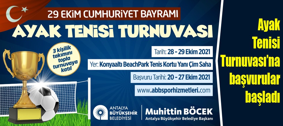 Antalya Büyükşehir Belediyesi Türkiye Cumhuriyeti'nin kuruluşunun 98. yıl dönümü nedeniyle 29 Ekim Cumhuriyet Bayramı Ayak Tenisi Turnuvası düzenliyor. Katılmak isteyenler 27 Ekim’e kadar www.abbsporhizmetleri.com adresinden başvuru yapabilecek.