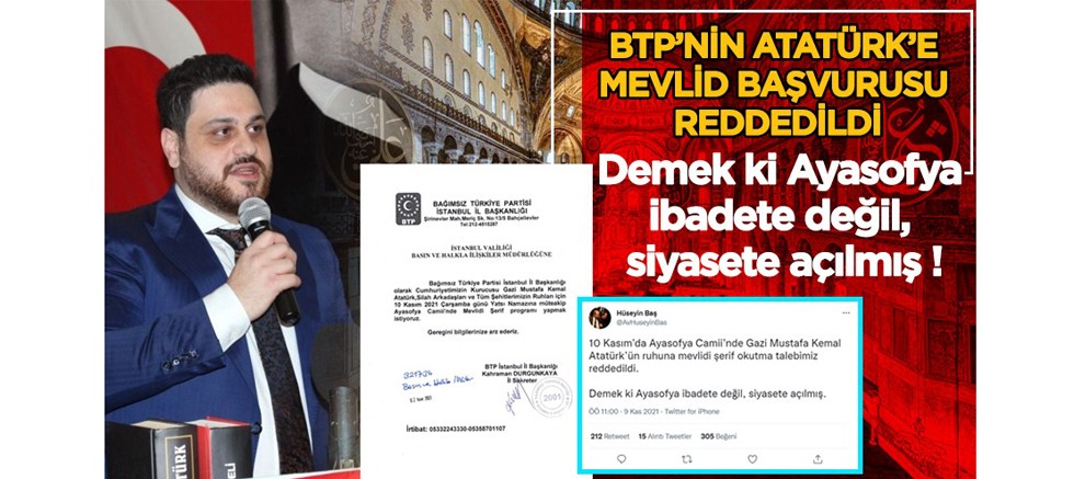 Bunun üzerine 2 Kasım'da İstanbul Valiliği’ne dilekçe sunan BTP İstanbul İl Başkanlığı, Atatürk, silah arkadaşları ve tüm şehitlerimiz için 10 Kasım’da Ayasofya Camii’nde Mevlidi Şerif programı için izin başvurusu yaptı.