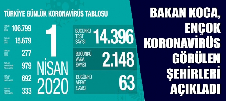 Türkiye'de son 24 saatte 2148 kişiye Kovid-19 tanısı konuldu, 63 kişi hayatını kaybetti, vaka sayısı 15 bin 679'a, can kaybı 277'ye ulaştı. Sağlık Bakanı Koca, 39 ilde can kaybı yaşandığını belirtirken, en fazla koronavirüs vakasının İstanbul'da görüldüğünü, bu ili İzmir ve Ankara'nın takip ettiğini bildirdi.