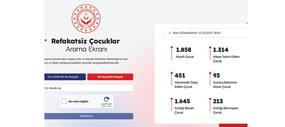 Aile ve Sosyal Hizmetler Bakanı Derya Yanık, Kahramanmaraş merkezli gerçekleşen depremler sonrasında ailesi bulunamayan refakatsiz çocuklara ilişkin yeni bir hizmeti daha hayata geçirdiklerini belirterek, “Vatandaşlarımız artık Bakanlığımızın web sitesinde yer alan sorgu ekranından gerekli bilgileri girerek kayıt altına aldığımız rekafatsiz çocuklara yönelik bilgilere hızlı bir şekilde ulaşabilecek” dedi.
