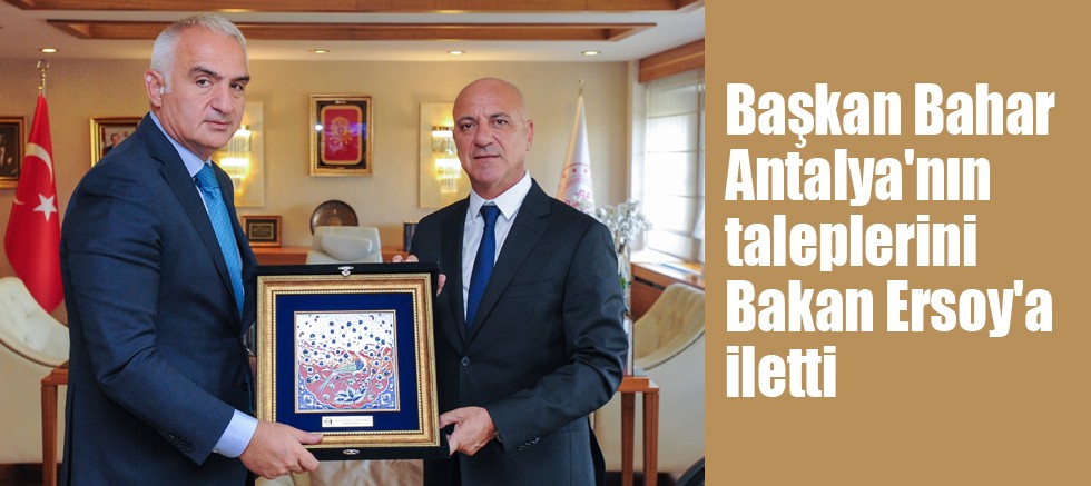 Antalya’da turizmden faydalanabilmek adına öneri ve taleplerini dile getiren Başkan Bahar sözlerini şöyle sürdürdü; “Turizmin çeşitlendirilmesi, eko turizm, spor, sağlık, kış turizmi ve gastronomi, eğitim gibi alanlarda farklılık yaratılması sektörlerimizin en önemli talepleri arasında yer alıyor. Dijital bir kent oluşturmak, kent ve sokak mimarisine yönelik çalışmaların yapılması, festivaller ve özellikle ulaşım konusunda çeşitlilik bizler için çok önemli. Kruvaziyer turizminin geliştirilmesi, liman – havalimanı ve kent merkezi arasında ulaşımın koordine edilmesi, demiryolu ulaşımının şehrimize ulaştırtılması gibi konuların ele alınması ve çözüm odaklı çalışmalar başlatılması konusunda desteğini istedik. Elimizi taşına altına koymaya hazırız.”