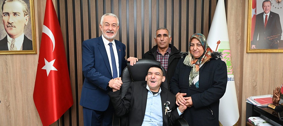 3 Aralık Dünya Engelliler Günü dolayısıyla engelli Mert Çoban ailesiyle birlikte Belediye Başkanı Şükrü Başdeğirmen’i ziyaret etti. Başkan Başdeğirmen, Mert’in belediye başkanlığı koltuğuna oturma hayalini gerçekleştirerek, başkanlık görevini temsilen kendisine devretti.