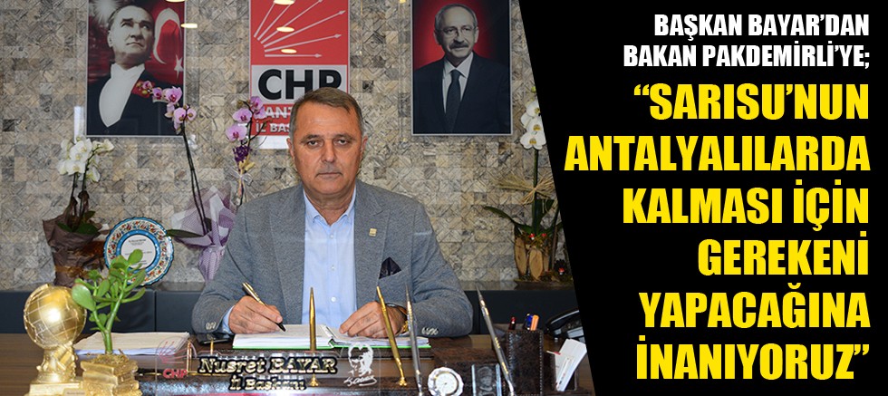 Konyaaltı'nda bulunan Sarısu Piknik ve Mesire alanı ile ilgili MUÇEV'e kiralanması konusunda Tarım ve Orman Bakanı Bekir Pakdemirli'ye seslenen CHP İl Başkanı Nusret Bayar "Tarım ve Orman Bakanı Bekir Pakdemirli’nin konuya gereken önemi ve hassasiyeti göstererek; Sarısu Piknik ve Mesire alanı işletmesinin, hak sahibi olan Antalyalılara, dolayısıyla Antalya Büyükşehir Belediyesi’ne verilmesi için gereken çalışmayı yapacağına inanıyoruz" dedi.