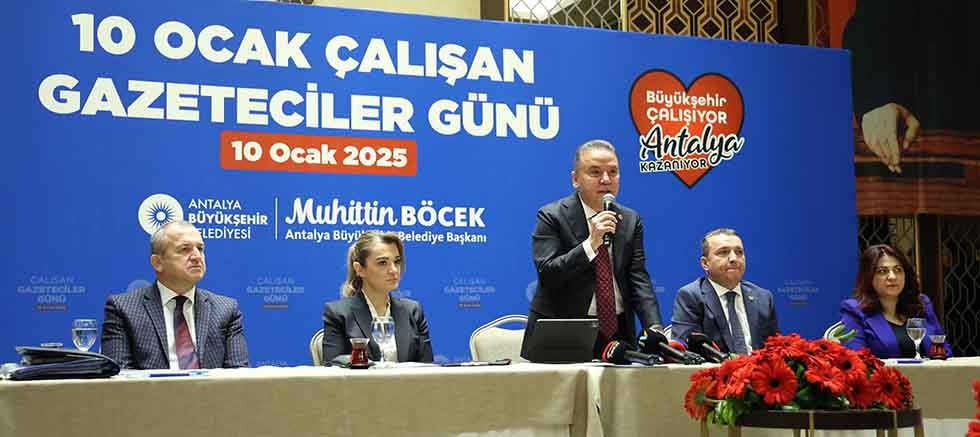 Antalya Büyükşehir Belediye Başkanı Muhittin Böcek, 10 Ocak Çalışan Gazeteciler Günü’nde basın emekçileriyle bir araya geldi. Antalya Gazeteciler Cemiyeti işbirliğiyle gerçekleşen buluşmaya Cemiyet Başkanı İdris Taş ve çok sayıda gazeteci katıldı. Gazetecilere ‘Sizler benim çalışma arkadaşımsınız diyen’ Başkan Muhittin Böcek, “30 yıldır beraberliğimiz devam ediyor. Sizlerin sorunlarını çok yakından biliyorum. Gazetecilik meslek kanunu bir an önce çıkmalıdır. Bu kanuna mecliste biz de destek vereceğiz. 2025 yılı itibarıyla ayda bir gazeteciler ile bir araya geleceğiz” dedi.
