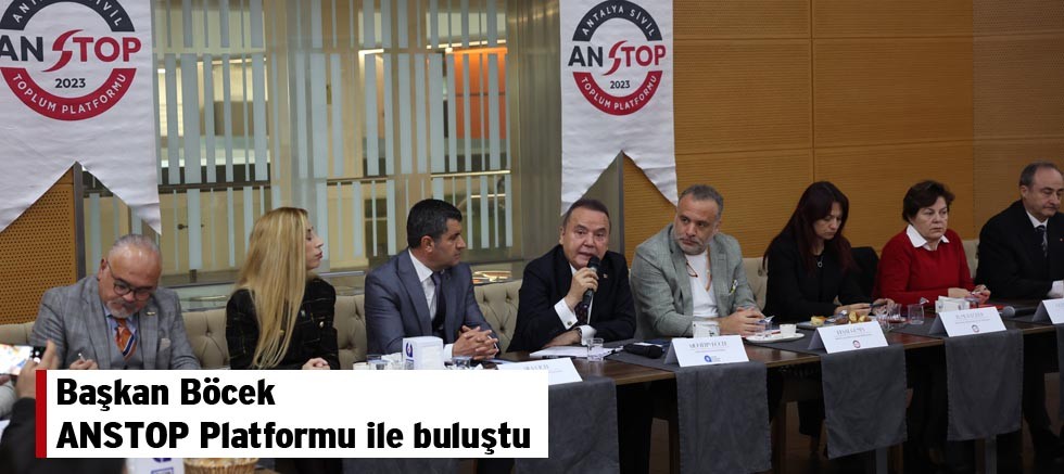 Antalya Büyükşehir Belediye Başkanı Muhittin Böcek, Antalya Sivil Toplum Platformu (ANSTOP) yönetimi ve üyeleriyle bir araya geldi. ANSTOP Kurucu Üyesi ve Sözcüsü Reşat Güney, kurucu üyeler Ekonomi İş Geliştirme Derneği Başkanı İzzet Ünlü, Harita ve Kadastro Mühendisleri Odası Antalya Şube Başkanı Okan Hançer, Peyzaj Mimarları Odası Antalya Şube Başkanı Gülsüm Kıldan, Antalya Şehir Plancıları Odası Şube Başkanı Funda Yörük, Türkiye Spor Yazarları Derneği Antalya Şube Başkanı Şifa Çiçek, Seyahat Acenteleri Yöneticileri Derneği Başkanı Mehmet Gem’in katılımı ile gerçekleştirilen toplantıda, Antalya'nın sorunları konuşuldu, talep ve öneriler dile getirildi. Ulaşımdan altyapıya, turizmden kültür ve çevreye pek çok konunun görüşüldüğü toplantıda, yapılacak projeler ile ilgili birlik ve beraberlik içinde hareket edileceği vurgusu yapıldı.