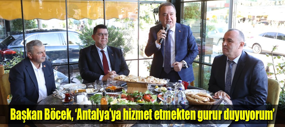 Antalya Büyükşehir Belediye Başkanı Muhittin Böcek, Antalya Esnaf ve Sanatkarlar Odaları Birliği (AESOB) Başkanı Adlıhan Dere, Antalya Servisçiler Odası Başkanı Süleyman Şahin, Konyaaltı Muhtarlar Derneği Başkanı Faruk Kıldıran ve Konyaaltı servisçi esnafı ile buluştu. Antalya Servisçiler Odasının Konyaaltı Bölgesi Servisçi esnafı için düzenlediği kahvaltı programda konuşan Büyükşehir Belediye Başkanı Muhittin Böcek, kendisinin de ulaşım esnaflığından geldiğini hatırlatarak, doğup büyüdüğü topraklara önemli ve anlamlı hizmetler gerçekleştirmenin mutluluğunu ve gururunu yaşadığını söyledi.
