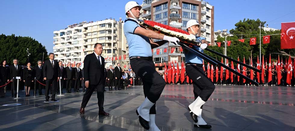 Genel Sekreter Cansel Tuncer, Atatürk Anıtı’na çelenk sundu. Saat 09.05’te siren sesiyle birlikte iki dakikalık saygı duruşunda bulunuldu. Siren seslerinin duyulmasıyla birlikte Büyükşehir Belediyesi önünden geçen araç sürücüleri de araçlarından inerek, saygı duruşuna eşlik etti. İki dakika boyunca hayat dururken, yoldan yürüyen vatandaşlar da saygı duruşuna geçti. İstiklal Marşı’nın okunmasının ardından anma töreni sona erdi.