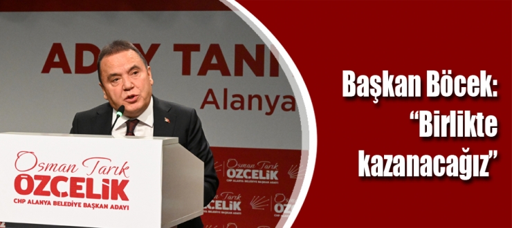 CHP Alanya Belediye Başkan Adayı Osman Tarık Özçelik’in tanıtım toplantısına katılan Büyükşehir Belediye Başkanı Muhittin Böcek, “Kimseyi ötekileştirmeden, halkımıza hesap vererek, hiçbir yanlışın içerisinde olmadan yolumuza devam edeceğiz. Alanya kazanacak. Antalya kazanacak. Yine kazanacağız, birlikte kazanacağız” dedi.