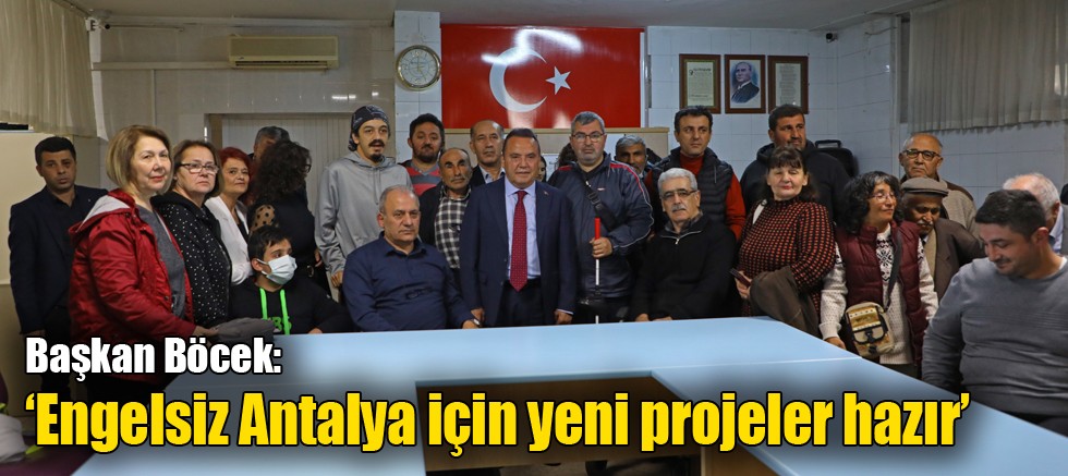 Antalya Büyükşehir Belediyesi olarak, engelli bireylerin, yaşam kalitelerini yükseltmek, sosyal hayata daha aktif katılımlarını sağlamak, sorunlarına daha kolay ve daha hızlı çözüm bulabilmek amacıyla gece gündüz çalıştıklarını ifade eden Muhittin Böcek, şöyle konuştu: “Planlı kurallı bir kent hedefiyle çıktığımız yolda, engelli bireylerin ihtiyaçlarını dikkate alarak, sosyal yaşamda yer almaları için çaba gösteriyoruz. Antalya merkez ve ilçelerimizde bulunan engelli hizmet merkezlerimizle engellilerin sorunlarına daha kolay ve daha hızlı çözüm konusunda yardımcı oluyoruz. Engelsiz ulaşım araçlarımız ile bedensel engeli vatandaşlarımıza, hastane ve diğer kamu kurum ve kuruluşlarındaki randevuları için ücretsiz ulaşım hizmeti vermekteyiz. Engelli vatandaşlarımıza, ihtiyaçları doğrultusunda; tekerlekli sandalye, beyaz baston, gıda, aşevi, eşya, giysi, nakdi ve ayni yardımlar yapıyor, danışmanlık-rehberlik hizmetleri veriyoruz. Evde bakım ekibimizdeki doktor ve hemşirelerimiz, engelli bireylerin sağlık kontrollerini yapmakta, engelli vatandaşlarımızın öz bakımları, ev temizliği gibi günlük ihtiyaçlarını gidermekteyiz.”