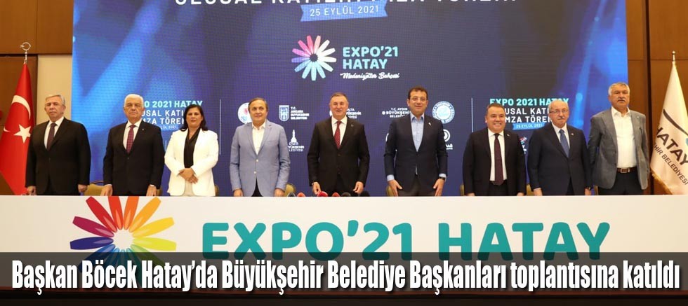 Antalya Büyükşehir Belediye Başkanı Muhittin Böcek, Hatay Büyükşehir Belediyesi ev sahipliğinde düzenlenen Büyükşehir Belediye Başkanları Toplantısı’na katıldı. Başkanlar toplantıda, Hatay EXPO 2021 organizasyonu hazırlıkları, tarımsal kalkınma ve mülteciler gibi birçok konuyu ele aldı.
