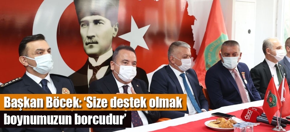 Antalya Büyükşehir Belediye Başkanı Muhittin Böcek, Çanakkale Zaferi’nin 107. Yılı nedeniyle Antalya’da bulunan şehit ve gazi derneklerini ziyaret etti. Başkan Böcek, şehit ve gazi ailelerine seslenerek, ‘Size destek olmak boynumuzun borcudur’ dedi.