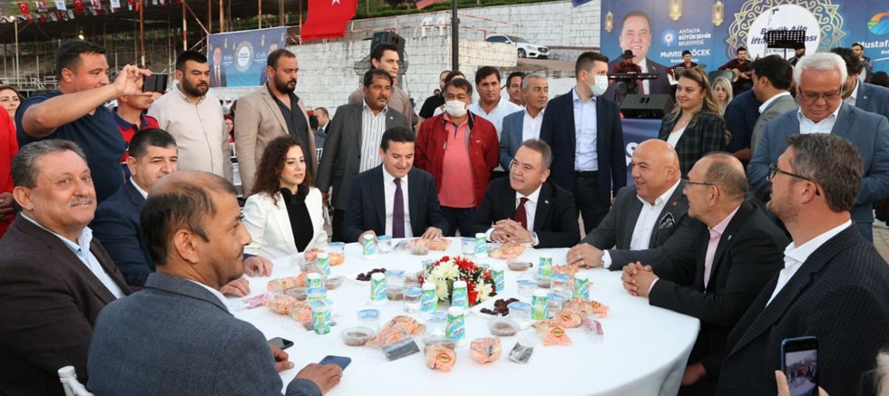 Kumluca Belediye Başkanı Mustafa Köleoğlu’nun Karatepe Stadyumu’nda düzenlediği Büyük Aile İftar buluşmasına katılan Büyükşehir Belediye Başkanı Muhittin Böcek, siyasi partilerin ilçe başkanları, meclis üyeleri, muhtarlar, STK temsilcileri ve çok sayıda Kumlucalı vatandaşla iftar yaptı. Başkan Böcek, 11 ayın sultanı Ramazan ayında Kumlucalı hemşerileri ile bir arada olmaktan mutluluk duyduğunu belirterek, “Mustafa Köleoğlu Başkanıma daveti için teşekkür ediyorum. Kumlucalı vatandaşlarım seni bekler deyince koşarak geldim. Allah’ım tuttuğunuz, tuttuğumuz oruçları kabul etsin” dedi.