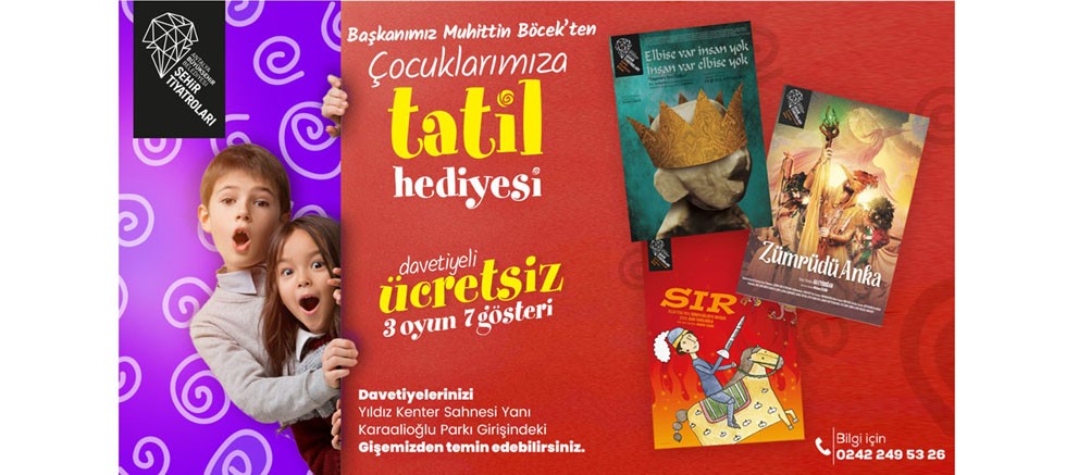 Antalya Büyükşehir Belediye Başkanı Muhittin Böcek, bir haftalık ara tatilde çocukların keyifli vakit geçirebilmesi amacıyla tiyatro hediye ediyor. Davetiye ile girilebilecek 3 çocuk oyunu 7 gösterim de çocuklarla buluşacak.