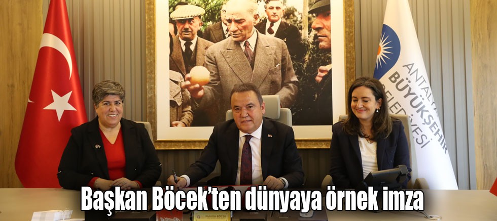 Antalya Büyükşehir Belediye Başkanı Muhittin Böcek, İLO 190 Sayılı Çalışma Yaşamında Şiddet ve Tacizi Önlemeye Yönelik Politika Belgesi’ni imzalayarak, dünyada ve Türkiye’de bir ilki gerçekleştirdi. Politika belgesi imza törenine, Başkan Muhittin Böcek, Türkiye Kadın Dernekleri Federasyonu Başkanı Canan Güllü, İLO Toplumsal Cinsiyet ve Sosyal Diyalog Yöneticisi Emel Akalın katıldı.