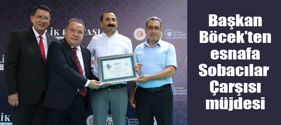 Esnafa bir de müjde veren Başkan Muhittin Böcek, “Bakırcılar ve Sobacılar Çarşısı kentimizde geçmişten ve günümüzden geleneklerin yaşatıldığı bir miras özelliği taşımaktadır. Sobacılar Çarşısı yenilenen haliyle 2009 yılından beri kullanılmaktaydı. Ancak bugüne kadar gereken ilgiyi göremedi. Burayı cazibe merkezi haline getirecek projemizi geçen hafta ihale ettik. 3 milyon 200 bin TL’ye tamamlanacak bu projeyle tüm dükkânlarımız ve ortak alanlarımız yenileniyor. Ayrıca sergi alanı, yapılacak tadilatla işlevsel hale getirilecek. Başta antika pazarı olmak üzere birçok etkinlikleri bu alanda gerçekleştireceğiz. Çarşının, hem Antalyalıların hem de kentimizi ziyaret eden yerli ve yabancı turistlerin ilgisini çeken bir merkez olmasını hedefliyoruz” diye konuştu.