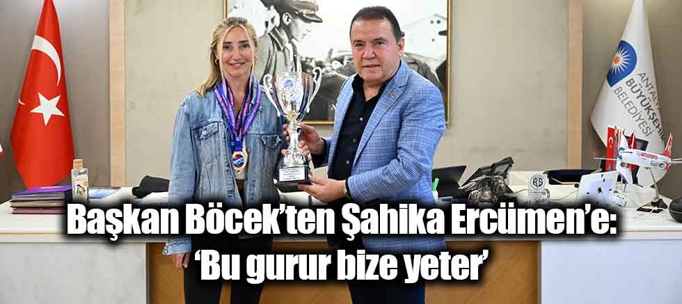 Başkan Muhittin Böcek, “Kupalarla geldim” diyen Dünya Serbest Dalış Rekortmeni Şahika Ercümen’i ‘Bu gurur bize yeter’ sözleriyle karşıladı. Şahika Ercümen’i başarısından dolayı kutlayan Başkan Böcek, “Şahika Ercümen rekortmen bir sporcumuz. 30 Ağustos Zafer Bayramı dolayısıyla Türkiye Dalış Şampiyonası’nda 4 madalya bizi onurlandırdı. Antalya Büyükşehir Belediyesi olarak elimizden gelen desteği vermeye devam edeceğiz. Büyükşehir Belediyesi olarak sporun her branşında birçok sporcuya destek veriyoruz. Bünyemizde ilerleyen süreçlerde yeni branşlar açacağız. Şahika’ya Eylül ve Ekim ayında mücadele edeceği Dünya Kupası ve Dünya Şampiyonası’nda başarılar dilerim. Dualarımız seninle” dedi.
