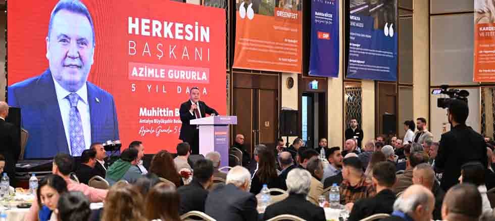 Antalya Büyükşehir Belediye Başkanı ve Başkan Adayı Muhittin Böcek, CHP İl Başkanı Nail Kamacı ve Antalya Milletvekili Sururi Çorabatır ile birlikte turizm sektörü temsilcileri ile iftar yemeğinde bir araya geldi. 5 yıllık görev süresi boyunca başta arıtmalar ve alt yapı yatırımları olmak üzere çevresel konulara da büyük önem verdiğini belirten Başkan Böcek, çevre odaklı turizm anlayışı ile Antalya’nın denizini, kumsalını, doğasını korumaya özen gösterdiklerini söyledi. Başkan Böcek, arıtmalara da ciddi bir yatırım yaptıklarını belirtti.