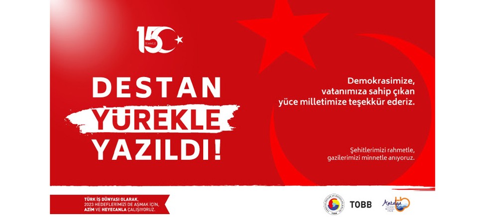 Antalya Ticaret Borsası (ATB) Başkanı Ali Çandır, 15 Temmuz Demokrasi ve Milli Birlik Günü dolayısıyla mesaj yayımladı. 15 Temmuz 2016’da hain darbe girişimiyle karşı karşıya kalan Türk milletinin demokrasi sınavından başarıyla geçtiğini kaydeden Çandır, “Hiçbir güç milletin iradesinin üzerinde değildir” dedi. Çandır, mesajında şunları kaydetti: