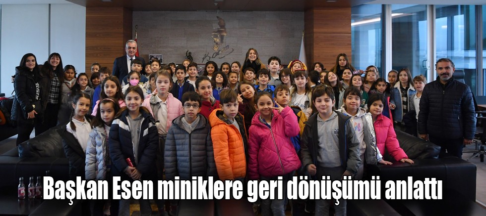 Konyaaltı Belediye Başkanı Semih Esen’i ziyarete gelen ilkokul öğrencileri, belediyenin geri dönüşüm ve atık yönetimi ile ilgili merak ettiği soruları Esen’e sorarak bilgi aldı.