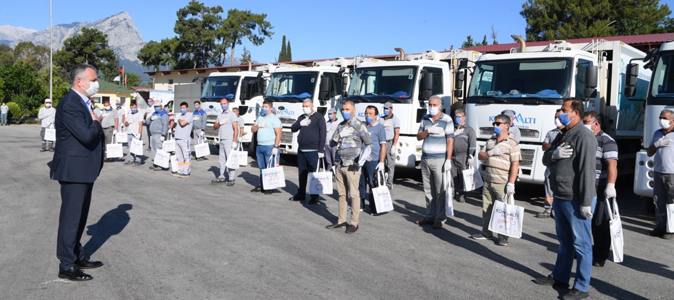 Konyaaltı Belediye Başkanı Semih Esen, pandemi döneminde büyük özveriyle çalışan Konyaaltı Belediyesi Temizlik İşleri Müdürlüğü çalışanlarını, Ramazan Bayramı’nın ilk günü ziyaret ederek bayramlarını kutladı.