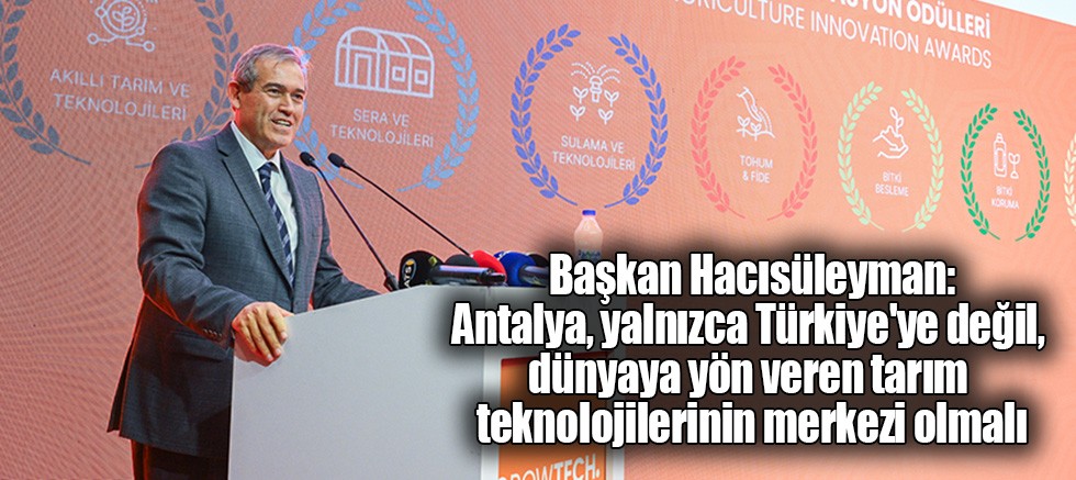 Antalya’nın tarımsal başarısına dikkat çeken Başkan Hacısüleyman, “Antalya; turizm başkenti olduğu kadar, örtü altı tarımda Türkiye’nin lideri ve tarımın başkenti konumundadır. Ülkemizde örtü altı tarım üretiminin yaklaşık yarısı Antalya’da gerçekleştirilmektedir. Bu sebeple inovasyonun, teknolojinin ve katma değerin şehrimizde daha da büyümesini arzuluyoruz. Temennimiz; yalnızca Türkiye’ye değil, dünyaya yön veren tarım teknolojilerinin Antalya’dan çıkmasıdır” dedi.