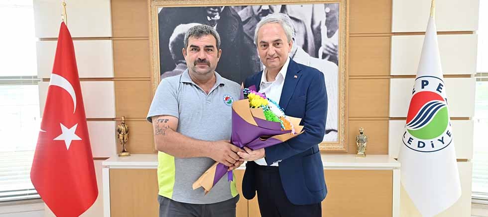 Kepez Belediye Başkanı Mesut Kocagöz, içinde 5 adet çeyrek altın bulunan çantayı bularak sahibine teslim eden Temizlik İşleri personeli Özkan Koçak’ı tebrik ederek, altınla ödüllendirdi.