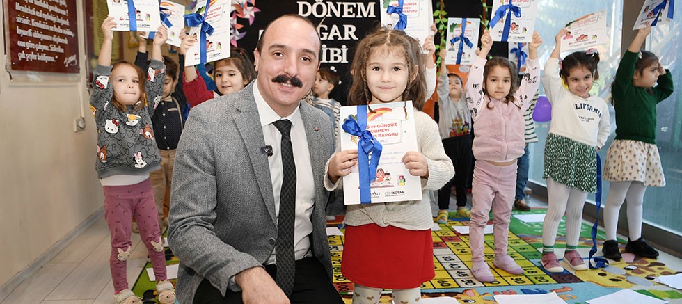 Karne sevinci yaşayan öğrencileri tebrik eden Başkan Kotan, “Bugün, kreşlerimizde eğitim gören öğrencilerimizin karne heyecanına tanıklık ettik. Miniklerimizin gözlerindeki heyecanı gördüğümde bir kez daha umut doldum. Her birini kendi çocuğumuz gibi gördüğümüz miniklerimizin güvenli bir ortamda eğitim görmeleri bizler için çok önemli. Eğitim hayatlarının ilk adımı olan okul öncesi eğitimlerinde çocuklarımıza en iyi imkanı sunmak için var gücümüzle çalışıyoruz’’ dedi. Çocukların ve ailelerinin heyecanına ortak olmaktan duyduğu memnuniyeti ifade eden Başkan Kotan, ‘‘Çocuklarımızın her birini ayrı ayrı tebrik ediyor, eğitim hayatlarına yaptıkları katkı için ise öğretmenlerimize çok teşekkür ediyorum’’ dedi.