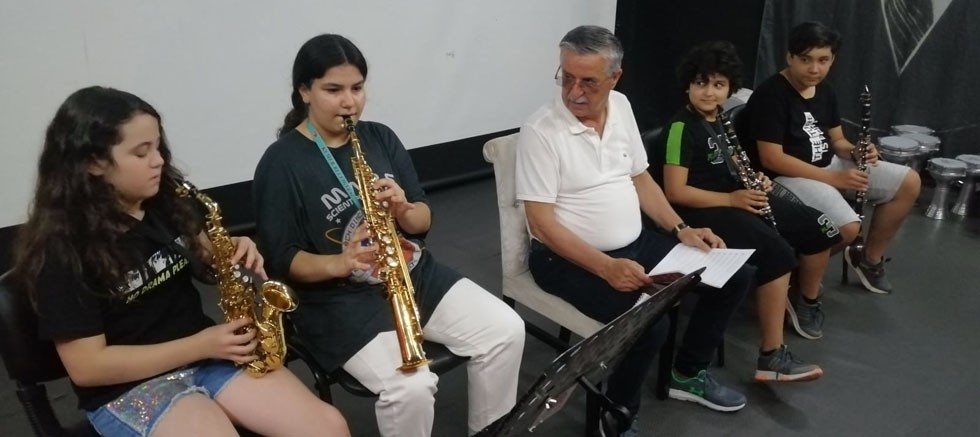 Başkan Topaloğlu’nun yanında enstrümanlara gönülden dokunan öğrencilerin heyecan ve azimli oluşları gözlerine yansıdı.