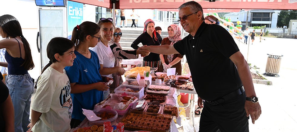Öğrencilerle de selamlaşarak bir ihtiyaçları olup olmadığını soran Başkan Topaloğlu, düzenlenen etkinlikte birbirinden lezzetli ürünlerin sunulduğu stantları gezdi.