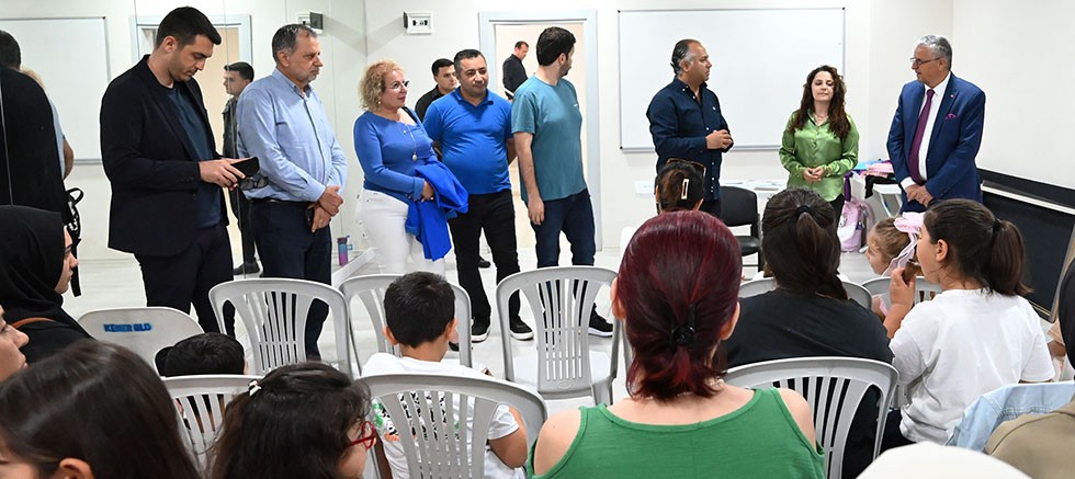 Başkan Topaloğlu ilk olarak merkezde ücretsiz drama ve tiyatro kursu alan kursiyerlerle sohbet ederek, kurs öğretmenlerinden çalışmalar hakkında bilgi aldı.