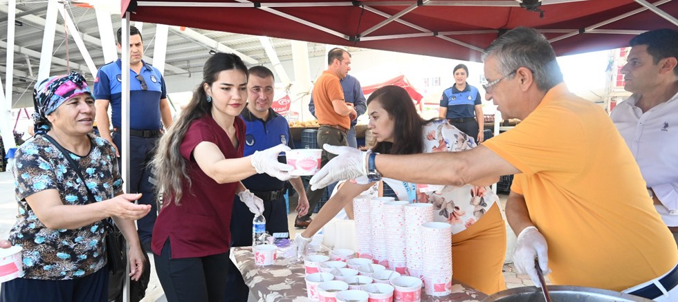 Pazar yerine gelen vatandaşlarla da sohbet eden Başkan Topaloğlu ve Başkan Yardımcısı Gül, daha sonra aşurenin başına geçerek vatandaşlara ve turistlere aşure ikram etti.