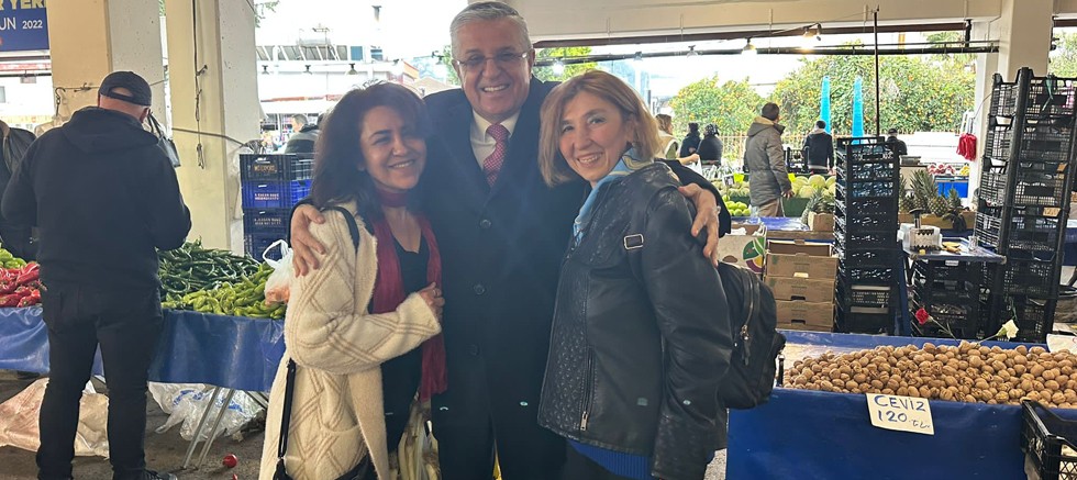 Kemer Belediye Başkanı Necati Topaloğlu, CHP Kemer İlçe Başkanı Adem Barış ve Kemer Belediyesi Başkan yardımcısı Emin Gül ile birlikte ilçe merkezinde açılan sebze meyve pazarını ziyaret etti.