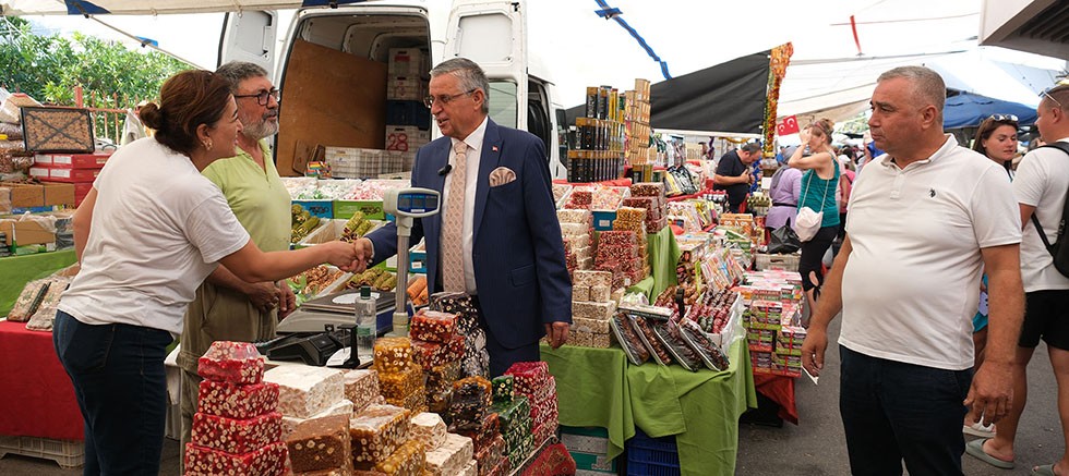 Aynı zamanda otopark olarak da kullanılan sebze ve meyve pazarında tezgah açan esnafı ziyaret eden Başkan Topaloğlu’na, Kemer Belediyesi Meclis Üyesi Mehmet Akın eşlik etti.