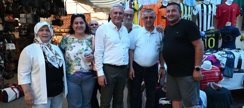 Perşembe günleri Deniz Caddesi üzerinde kurulan turizm tekstil pazarında tezgah açan esnafı ziyaret eden Başkan Topaloğlu ve Başkan Yardımcısı Gül, esnafla sohbet ederek hayırlı işler temennisinde bulundu.