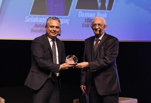 Söyleşinin ardından Başkan Uysal, katılımcılara üzerinde Antalya’nın tarihi noktalarında Üç Kapılar’ın işli olduğu plaket takdim etti.