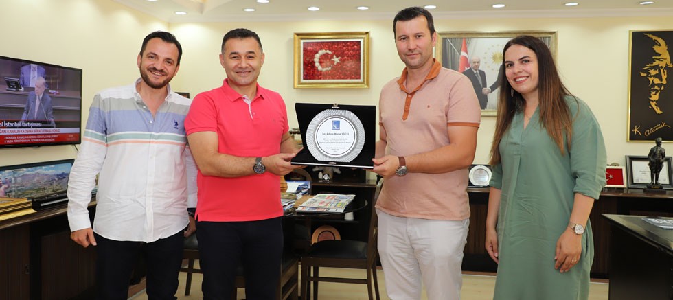 Alanya Hamit Özçelik İlk ve Ortaokulu Müdürü Muharrem Uğurlu ve Okul Aile Birliği Başkanı Nurten Soykuvvet, Alanya Belediye Başkanı Adem Murat Yücel’i ziyaret ederek, eğitim ve öğretime verdiği katkılardan dolayı teşekkür plaketi verdi.