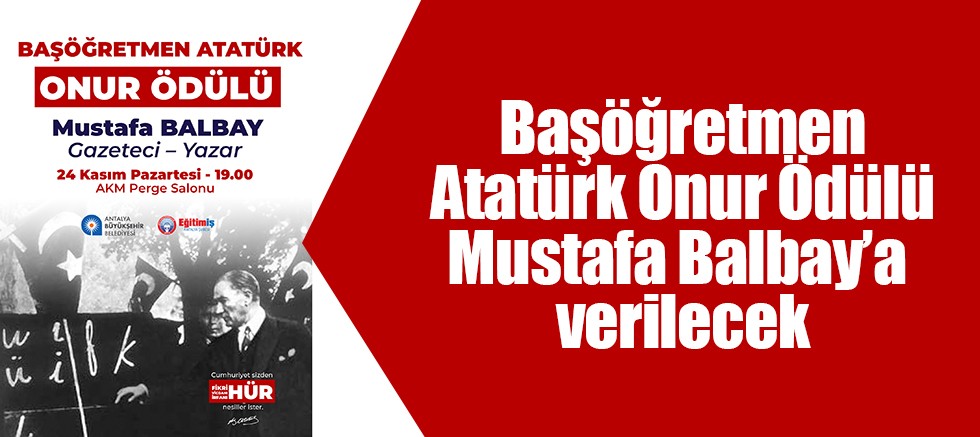 Antalya Büyükşehir Belediyesi ve Eğitim İş Sendikası’nın iş birliğiyle düzenlenen 17. Başöğretmen Atatürk Onur Ödülü bu yıl Gazeteci-Yazar Mustafa Balbay’a verilecek.